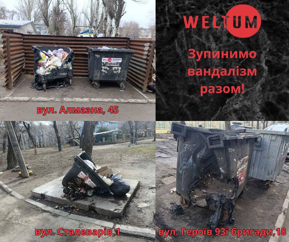 ТОВ «ВЕЛЬТУМ-Запоріжжя» систематично стикається з фактами пошкодження контейнерів, їх підпалами та використанням не за призначенням (зокрема для складування будівельних відходів). Кожен такий випадок — це додаткові витрати на відновлення, які могли б бути спрямовані на закупівлю паливно- мастильних матеріалів, враховуючи іх постійно зростаючу вартість.